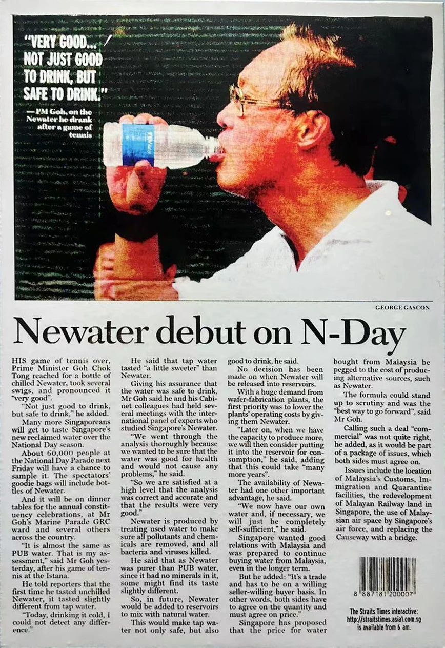 2002年8月1日,時任總理吳作棟在總統(tǒng)府打完網(wǎng)球后喝瓶裝新生水的照片公布,證明新生水安全可靠,達(dá)到可以飲用的標(biāo)準(zhǔn)。